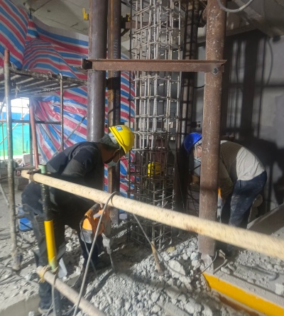 植筋与钢筋绑扎: 在原构件上钻孔植筋(作为连接筋),绑扎新增的受力钢筋和箍筋,确保新旧钢筋连接可靠。